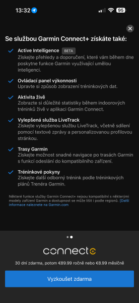 Garmin Connect+ je na 30 dní zdarma na zkoušku, pak vás vyjde na 8,99 EUR měsíčně nebo 89,99 EUR ročně.