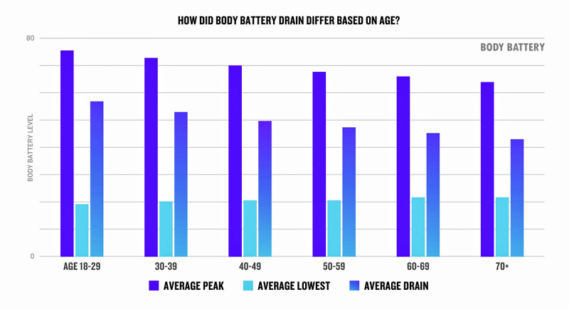 Mladší uživatelé měli vyšší maxima a nižší minima Body Battery, takže i když se více nabili, přes den své energie vydali o něco více. Nejvyšších hodnot dosahovali Portugalci. Nejméně aktivní, pokud se to tak dá říci, byli v Jižní Africe, kde jim na konci dne zbývalo průměrně ještě 24 bodů. Nejvíce dřou v Číně, kde byla nejvyšší průměrná spotřeba.