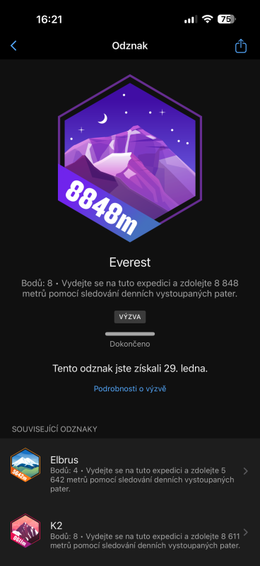 Pak je tu výstup na Mount Everest. Tento odznak získalo letos jen 0,2 % uživatelů (a autor tohoto článku byl jedním z nich). Celkem ho má pouze 0,7 % uživatelů. Ono také zdolat 8 848 výškových metrů není nic snadného.