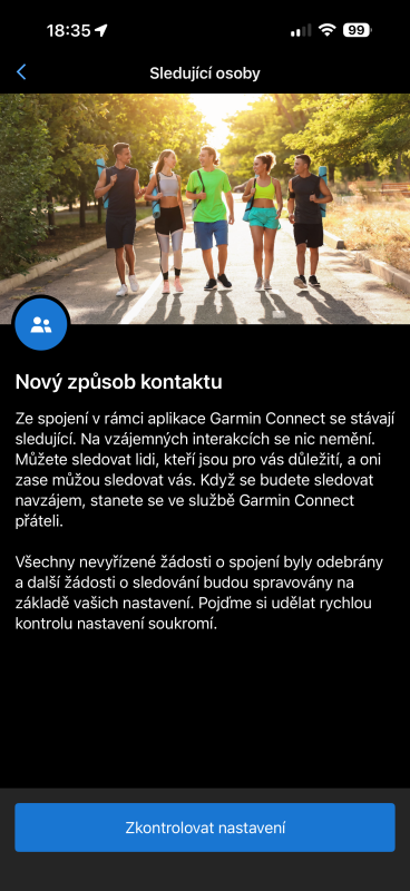 Pokud ale aktualizaci nainstalujete, banner se změní a už nabádá ke sledování přátel. Můžete v něm přímo kliknout na nabídku „Začít“. Ta popisuje změnu názvosloví a informuje o tom, že na vzájemných interakcích se nic nemění. Pořád můžete sledovat lidi, kteří jsou pro Vás důležití, a oni zase mohou sledovat Vás. Když se ale budete sledovat navzájem, stanete se ve službě Garmin Connect přáteli. Pokud jste před aktualizací měli nějaké žádosti o spojení, byly po ní odebrány.