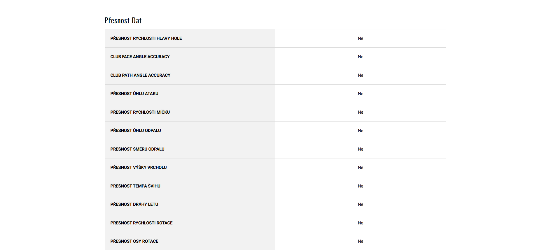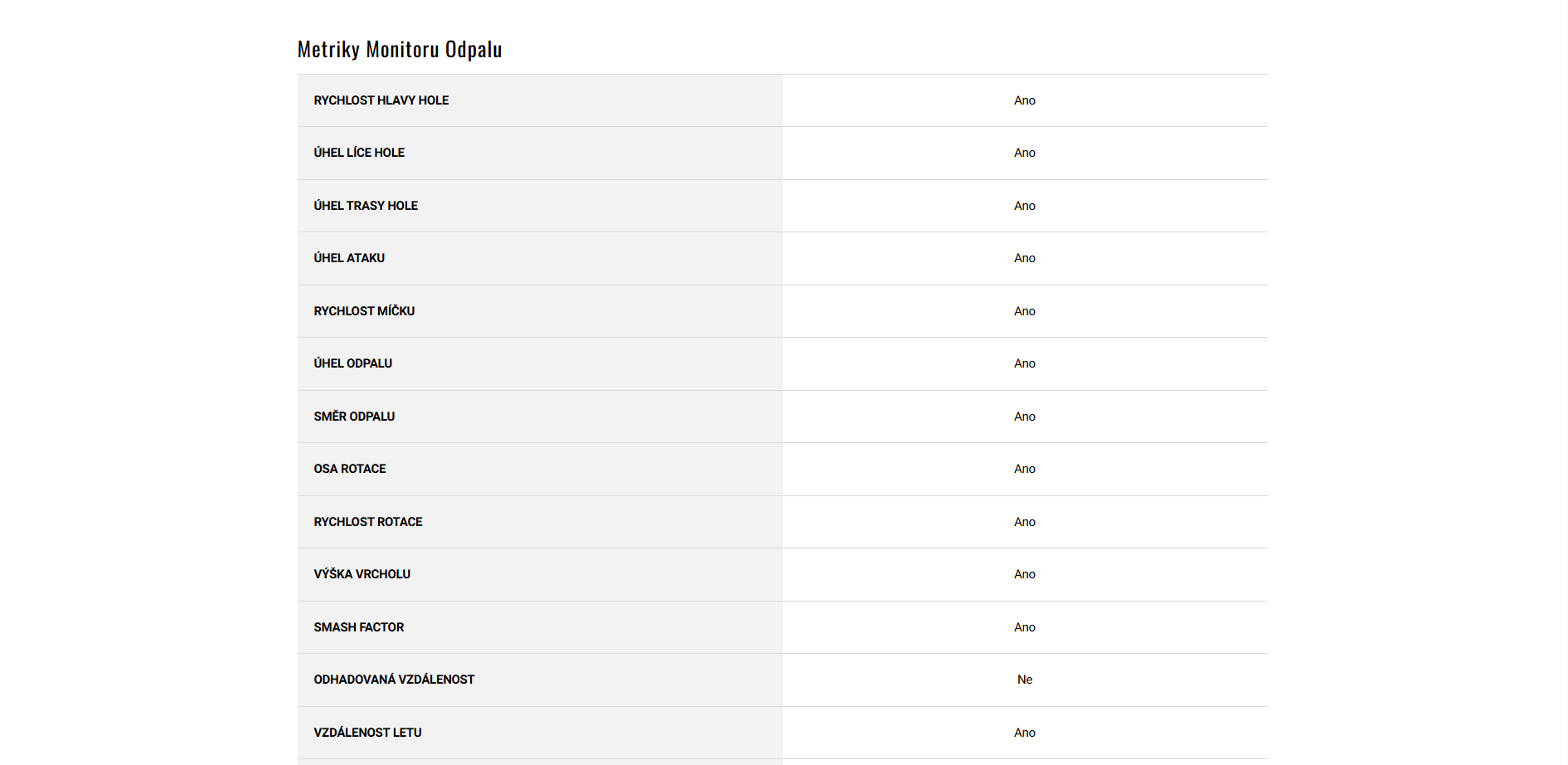 Vylepšete si konzistentnost švihu pomocí sledovaných metrik, k nimž mimo jiné patří rychlost hlavy hole, rychlost míčku, rotace míčku, úhel odpalu, směr odpalu nebo smash factor.