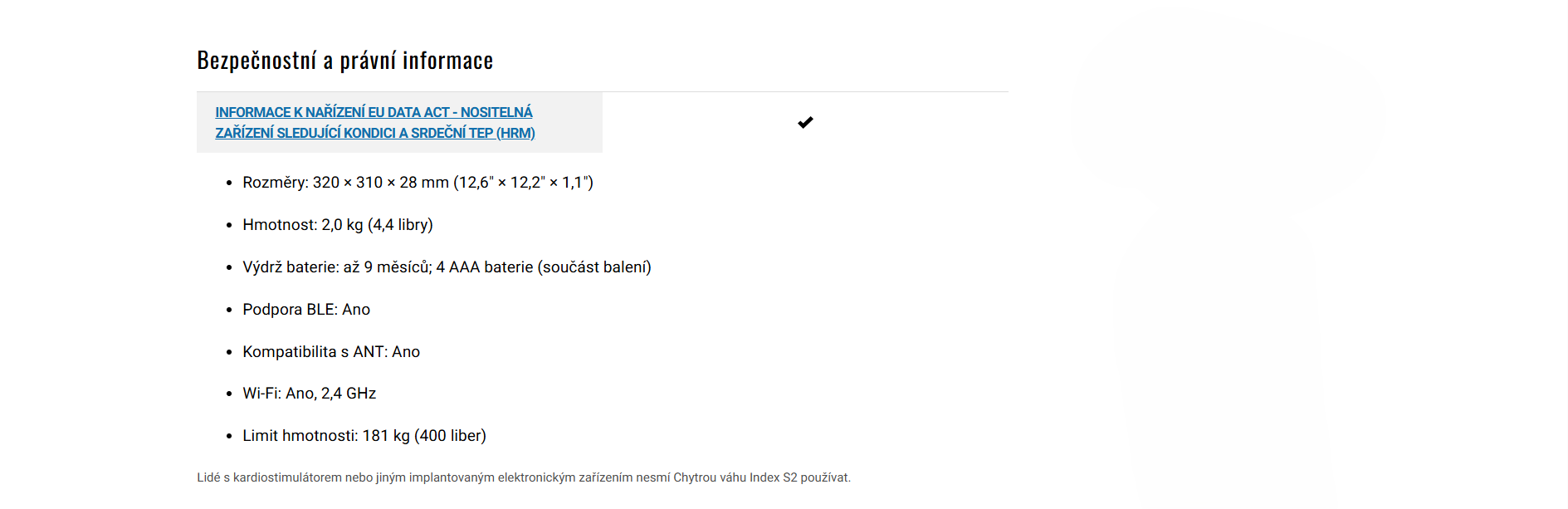Chytrá váha s měřením tělesných parametrů, automatickým rozpoznáváním uživatele a bezdrátovým přenosem měřených dat do tréninkového deníku Garmin Connect.