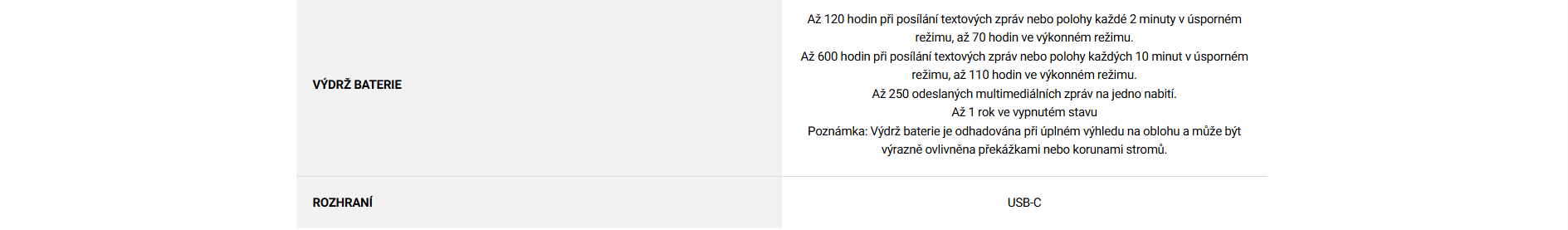 Vnitřní dobíjecí lithiová baterie nabízí výdrž až 25 dnů v režimu sledování v 10minutových intervalech.
