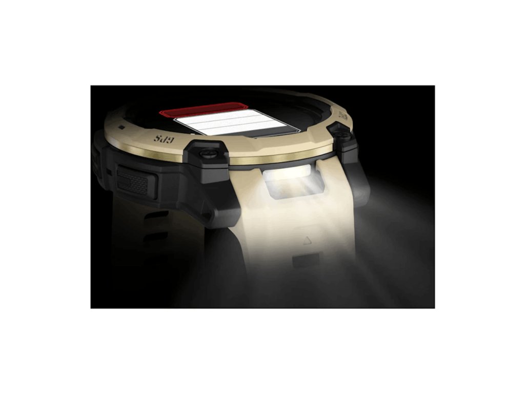 V pouzdře hodinek se ukrývá výkonná LED svítilna s nastavitelným jasem v několika úrovních a světlem bílé nebo červené barvy.