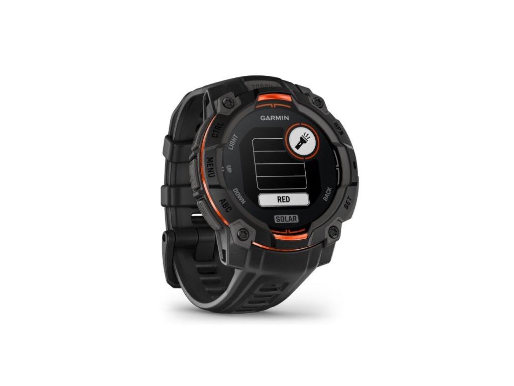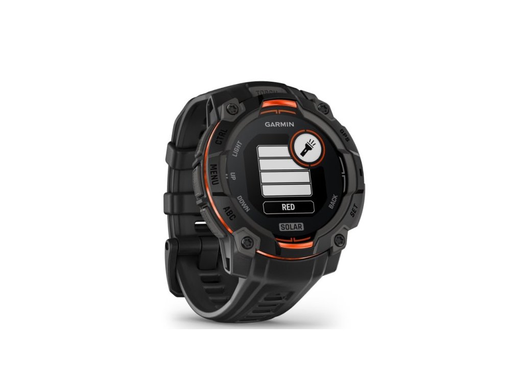 V pouzdře hodinek se ukrývá výkonná LED svítilna s nastavitelným jasem v několika úrovních a světlem bílé nebo červené barvy.