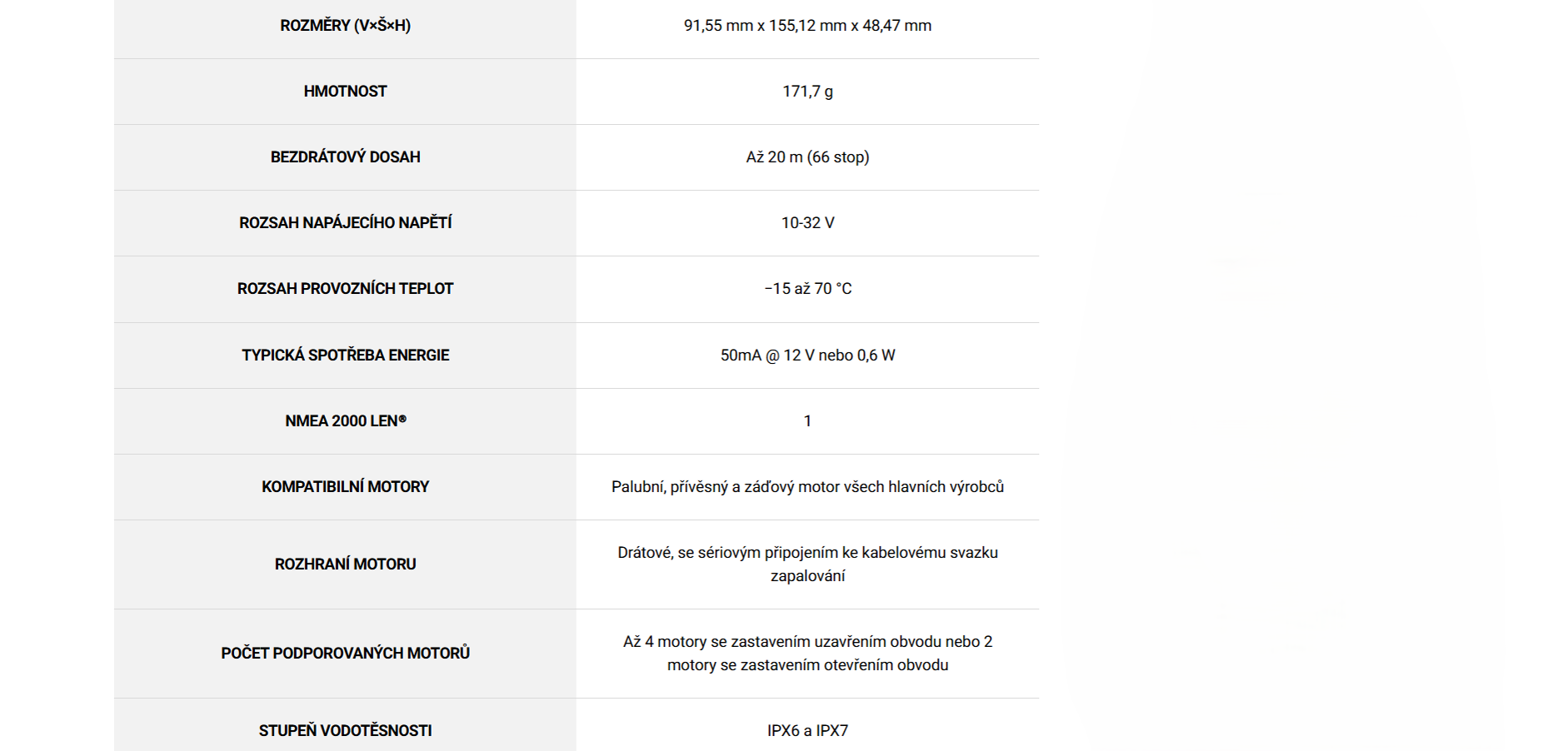 Detekce pádu kapitánského MOB tagu přes palubu aktivuje vypnutí motoru, označení trasového bodu MOB na chartplotteru a zvukový alarm na displeji i v centrální jednotce.
