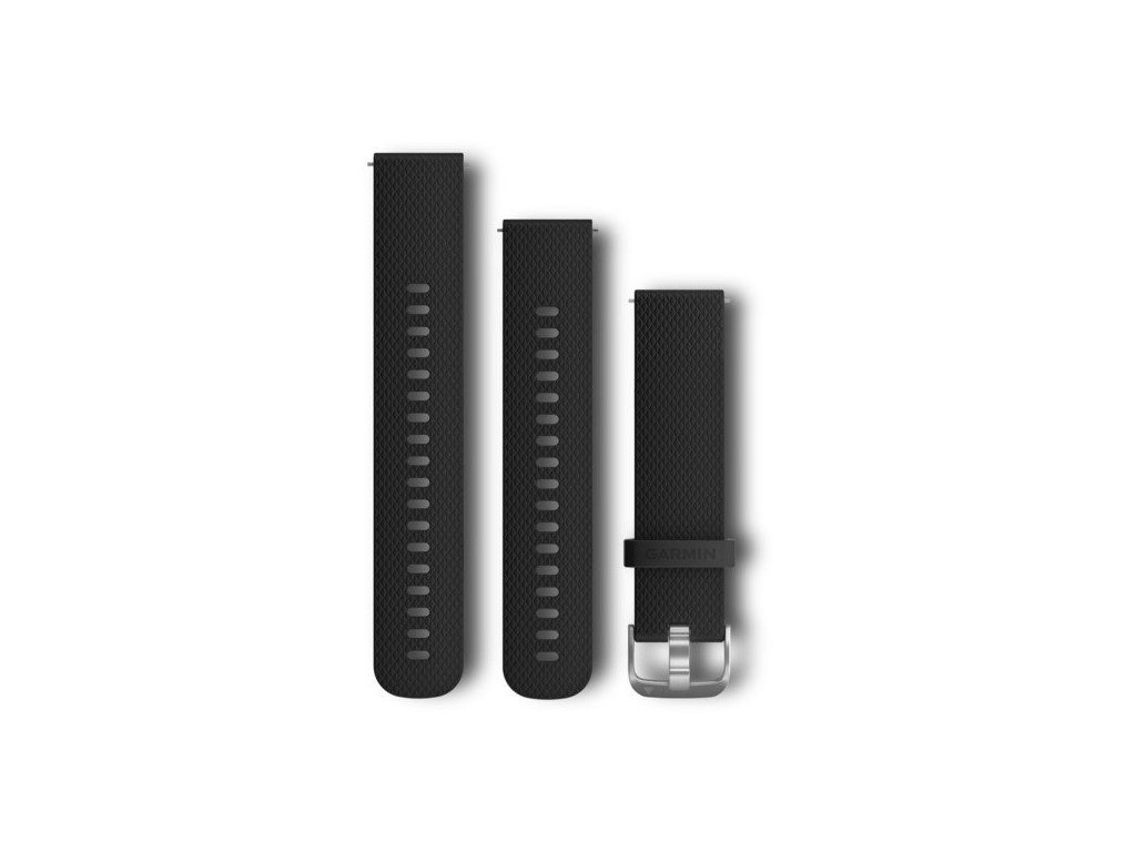 Náhradní černý silikonový řemínek se stříbrnou přezkou pro hodinky Garmin vívoactive3 Optic. Šířka řemínku 20mm, systém uchycení Quick Release. Použitelný pro hodinky: - vívoActive3 Optic - vívomove Optic - Forerunner 645 V balení dvě délky (S/M a L), pro obvod zápěstí (127–215 mm).
