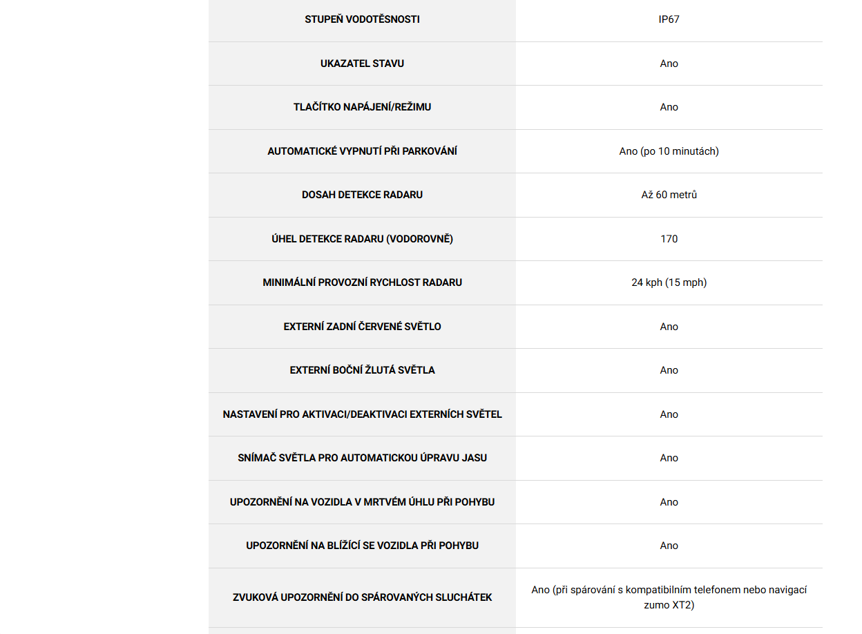 Tento výkonný zpětný motocyklový radar se záběrem mrtvých úhlů sleduje vozidla kolem vás a poskytuje vám lepší přehled o situaci na silnici. Externí světla zvyšují vaši viditelnost pro ostatní vozidla a podporují bezpečnější jízdu.